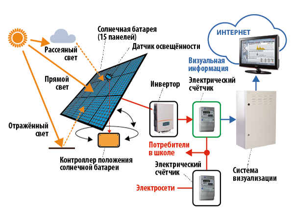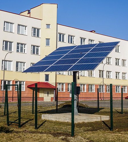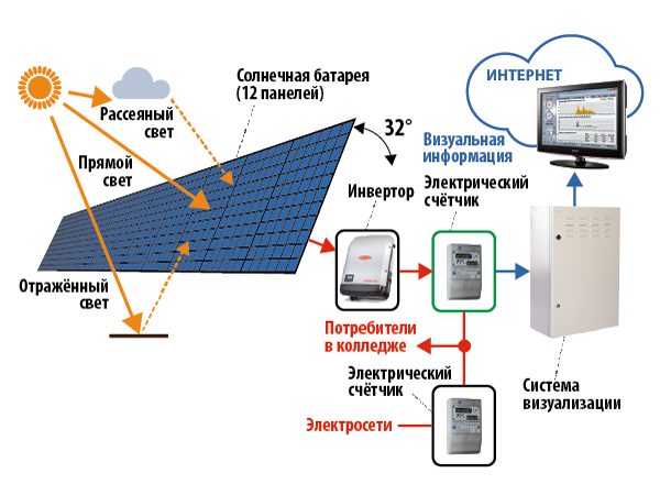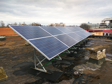 В электротехническом колледже стационарно установлены 12 поликристаллических солнечных модуля под углом в 32 градуса с азимутальной ориентацией на юг.
