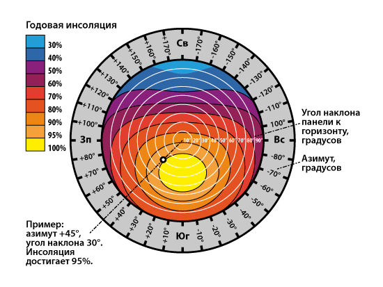 На приведенной диаграмме можно оценить зависимость годовой инсоляции от направления солнечных батарей.