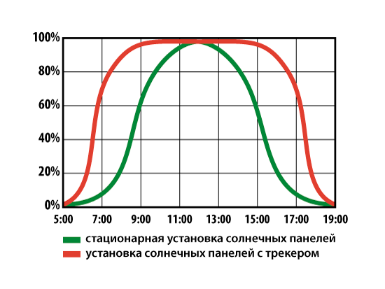 На диаграмме показано сравнение вырабатываемой мощности в течение светового дня стационарно установленными солнечными батареями и