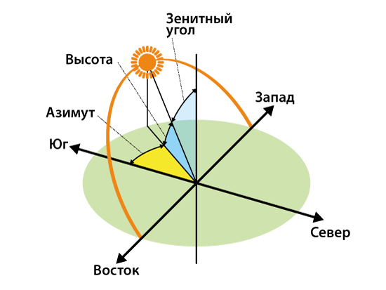 Азимут — это угол между направлением на Солнце и направлением на юг.